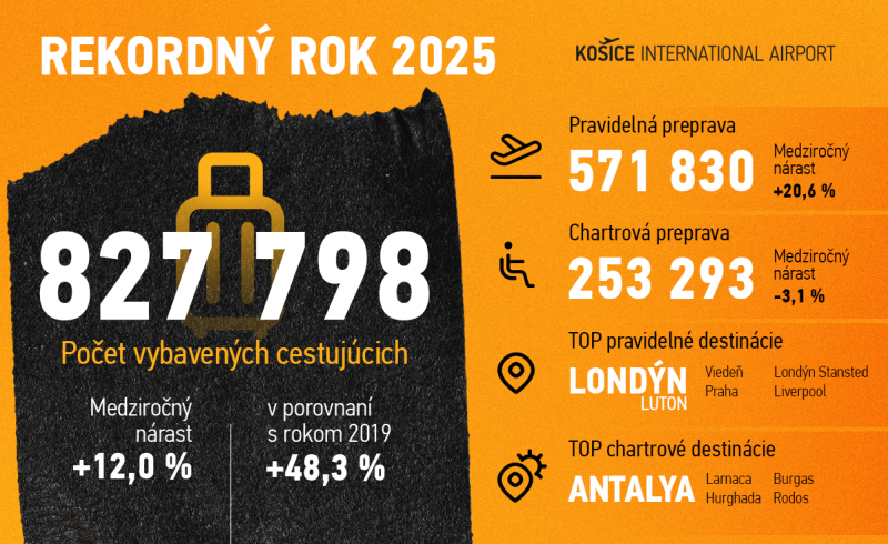 Letisko Košice pokračovalo aj v roku 2025 v intenzívnom raste, keď v priebehu roka vybavilo celkovo 827 798 cestujúcich, najviac v 101-ročnej histórii letiska. Tým zaznamenalo tretí rekordný rok po sebe. Medziročne ide o nárast o 12,5 % a v porovnaní s predpandemickým rokom 2019 pribudlo až 48,3 % cestujúcich.